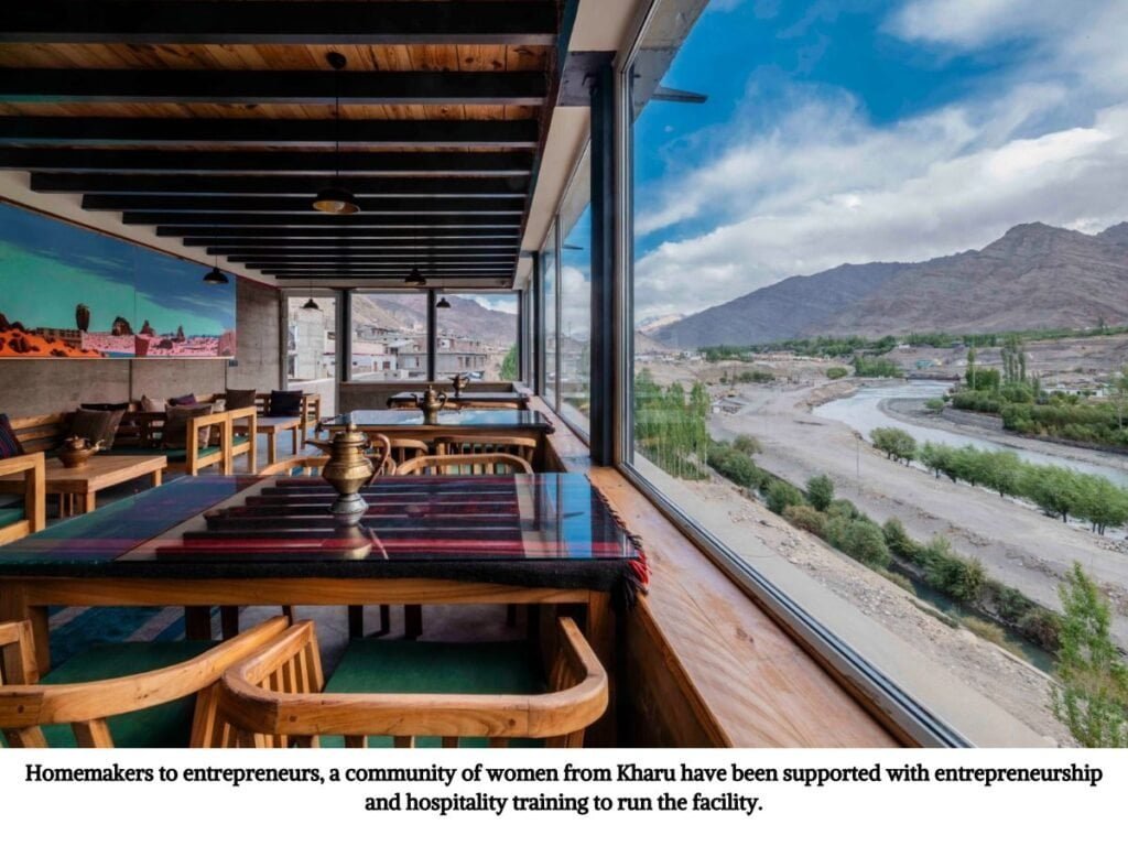 Ready for its first tourist season, the property has been managed by six self-help group (SHG) women from the Kharu village, aged 37 to 55 who volunteered for the opportunity. The women run a cafe, serving authentic Ladakhi dishes, made from locally sourced ingredients. They also manage the commercial and exhibition space and ensure that the public convenience facilities within the premises are usable throughout the year.
