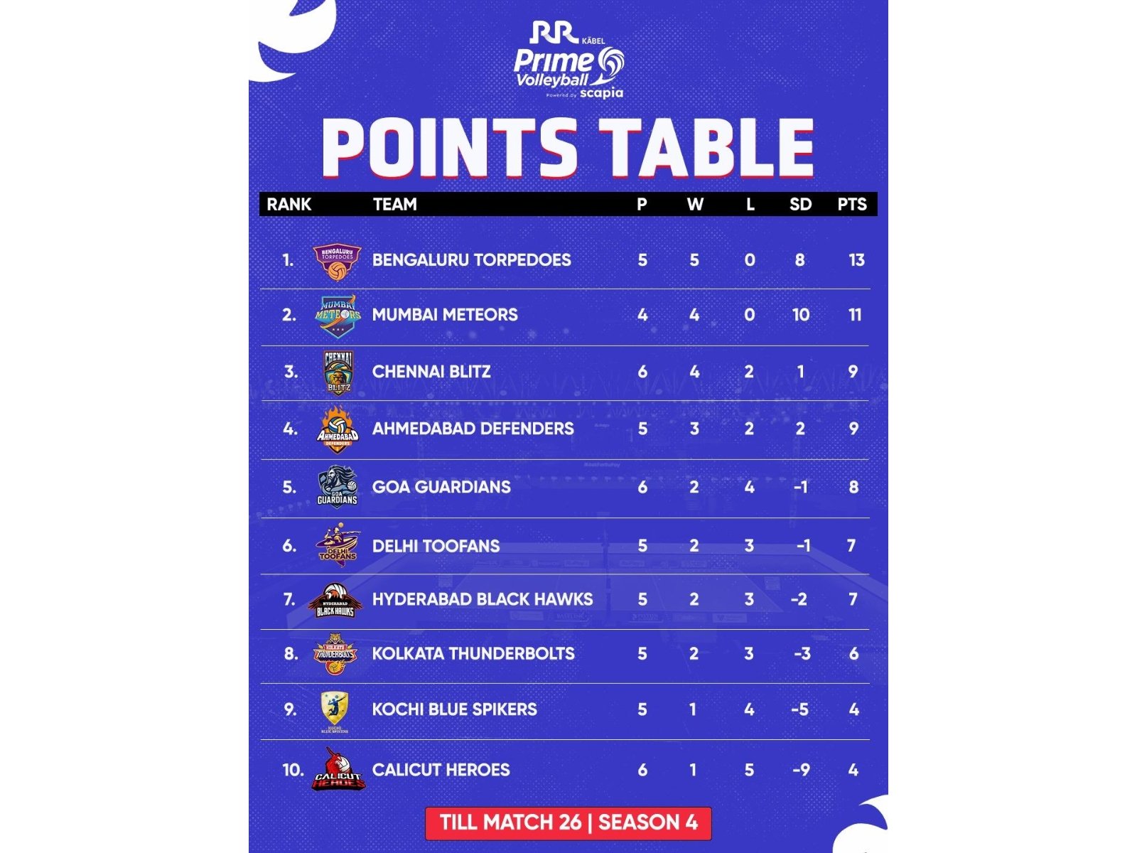 Delhi libero Anand showcased his agility with several stunning saves that kept his team in the contest. Setter Sameer maintained his fine rhythm, mixing up plays and providing multiple attacking options that consistently pressured the Toofans’ defence. The inclusion of Azizbek Kuchkorov further strengthened Chennai’s frontline as the Blitz tightened their grip on the game.